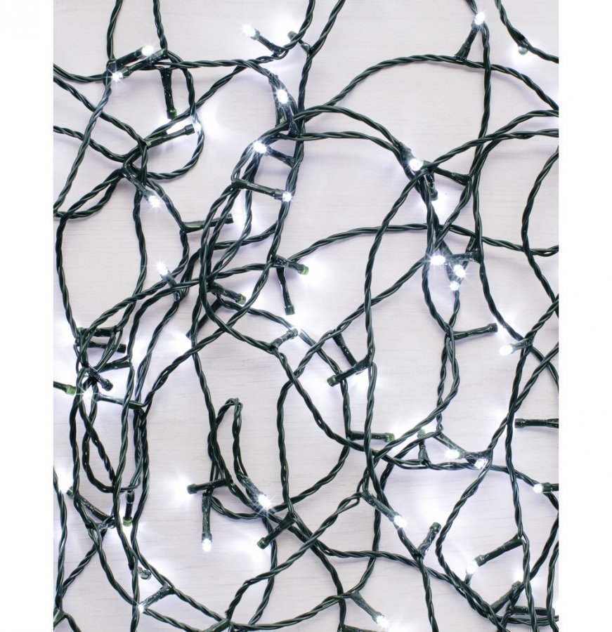 Kotikulta Led-valosarja 120 osaa. Valkoinen valon sävy. Vihreän lähtöjohdon pituus 5 m, valo-osuuden pituus 11,9 m, kokonaispituus 16,9 m. IP44/31V/3. 6VA