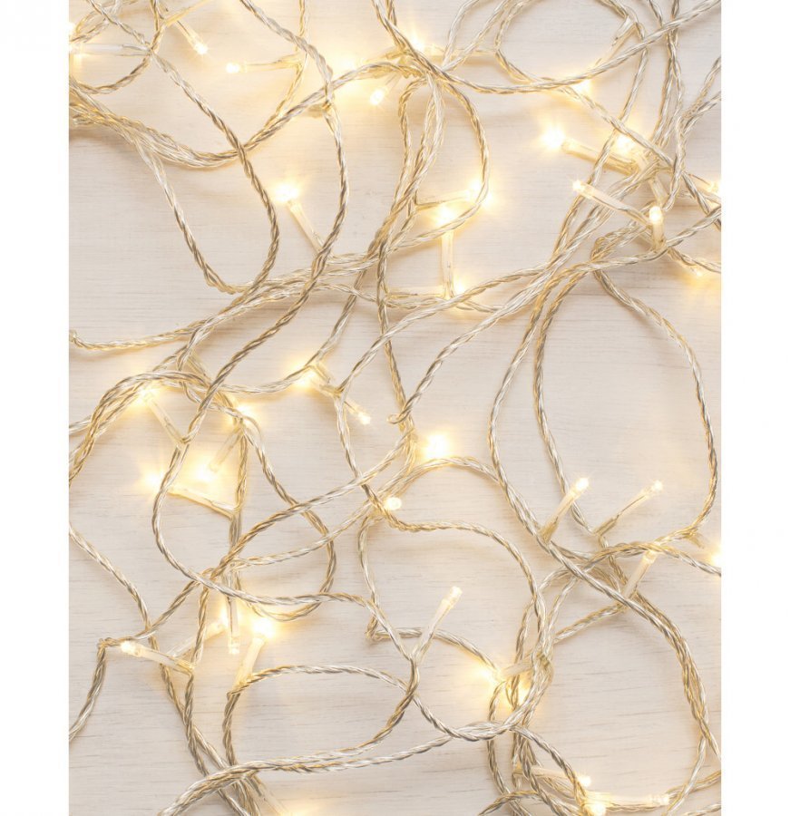 Verkkovirralla toimiva valosarja ulkokäyttöön. 120 lämpimänvalkoista LED-valoa on sijoitettu 15 cm:n välein (17,85 metrin matkalle), lisäksi 12 metrin liitosjohto verkkolaitteelle. Verkkolaitteen suojausluokka IP44.