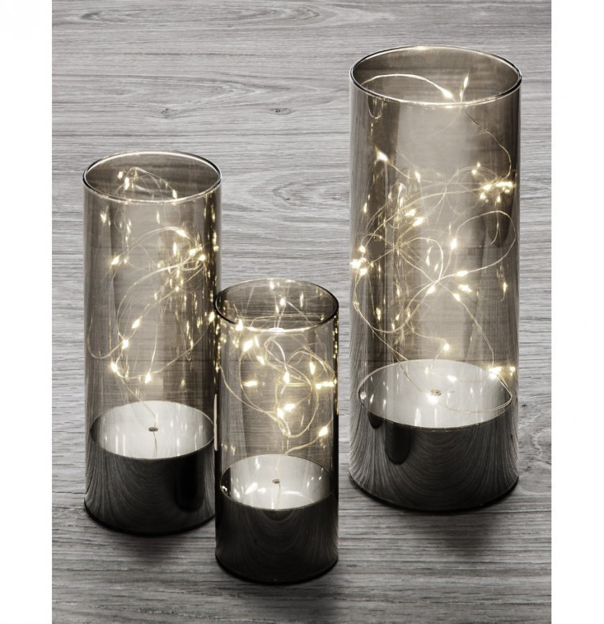 Settiin kuuluu kolme erikokoista lasisylinteriä, joiden sisällä on lämminsävyistä valoa loistava LED-valolanka. Valot toimivat kukin omilla paristoillaan (2 x AAA, 2 x AA, 3 x AA, paristot eivät sisälly pakkaukseen). Voit käyttää valoja sekä on/off-kytkimellä että ajastimella. Ajastinta käytettäessä valo syttyy aina 18 tunnin välein ja palaa 6 tuntia kerrallaan. Valaisimien mitat (Ø x k): 7 x 15 cm, 8 x 20 cm ja 10 x 25 cm.