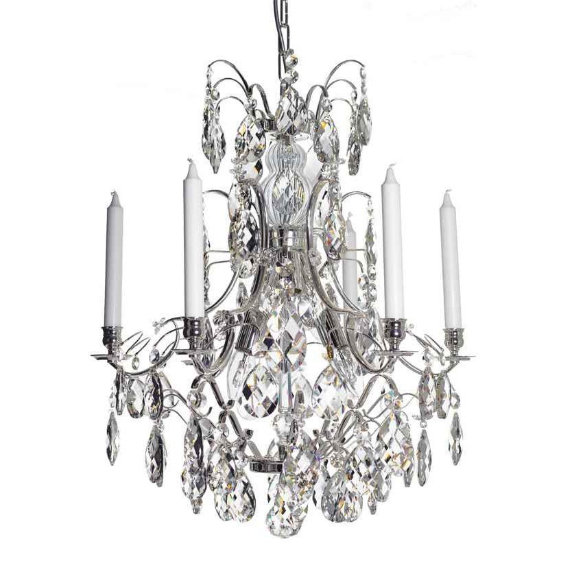 Mahtipontinen barokkityyli kukoisti 1600-luvun loppupuolella. Samoihin aikoihin aloitettiin myös ensimmäisten kristallikruunujen valmistaminen. Barokkikruunuille on ominaista ylenpalttinen koristeellisuus ja pyöreät pehmeät muodot. Tämä ajaton ja tyylitietoinen tyyli sopii niille, jotka haluavat sisustaa ja valaista kotinsa miellyttävän pehmeällä valolla. Krebsin käsinvalmistetuilla kristallikruunuilla voit muuttaa, luoda kontrasteja vanhan ja uuden välillä ja tehdä huoneesta eloisamman. Pompe barokkikruunussa on kauniit pyöristetyt muodot. Valaisin tarjoaa hienon kontrastin muuten pelkistettyyn ja moderniin sisustukseen. 6-haarainen kynttiläkruunu. Runko messinkiä. Pintakäsittely: niklattu. 3 kpl E-14 lampunpidikettä 40W. Käsinhiotut prismat 1A-laatu. Leveys: 54 cm Korkeus: 61 cm (ketju ei mukaan lukien). Paino: 11 kg. S/CE-merkitty. Hehkulamput eivät sisälly!.