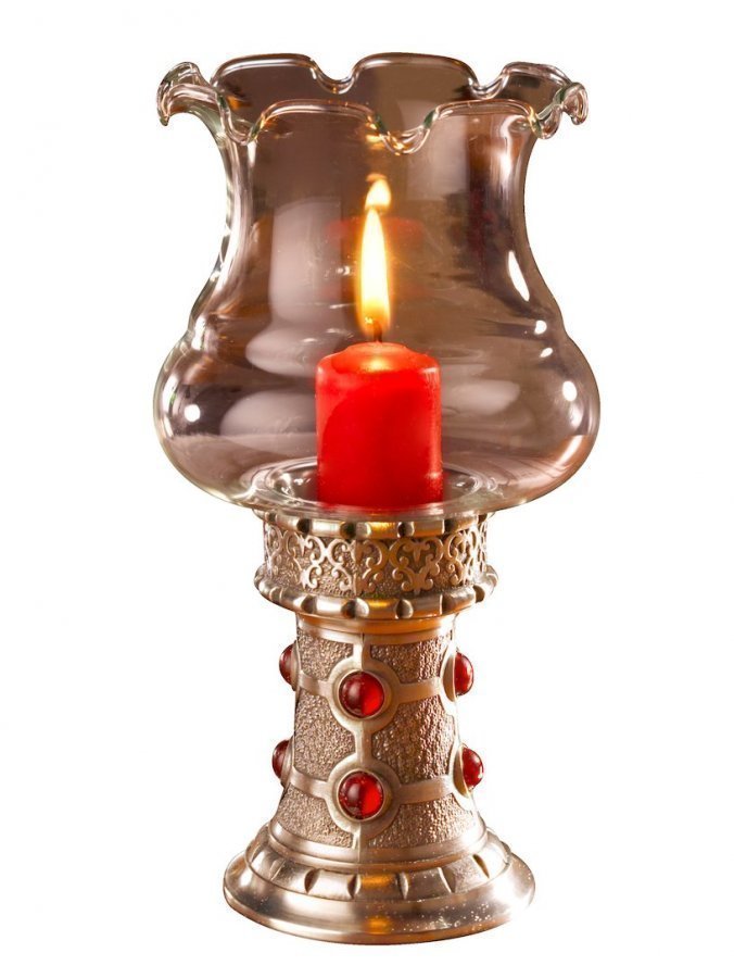 Tuikkulyhty, jossa on koristeellinen muotoilu. Suupuhallettu lasikupu. Sopii hyvin myös lahjaksi! Korkeus n. 19 cm. Materiaali tinaa ja lasia.