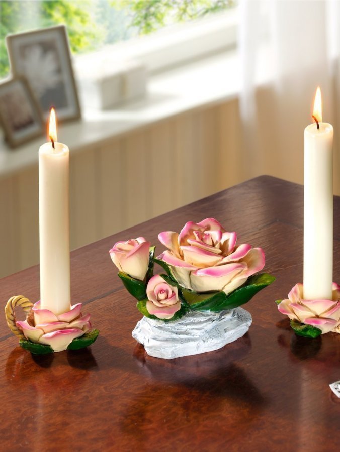 Pehmeä kynttilänvalo luo viihtyisää tunnelmaa etenkin pimeneviin iltoihin. Nämä kynttilänjalat luovat kauniin setin pöydän tai piirongin päälle. Kauniit kynttilänjalat on muotoiltu romanttisesti ruusuiksi ja settiin sisältyy lisäksi ruusukoriste. Kynttilät eivät sisälly toimitukseen. Materiaali on polyresiiniä. Mitat: kynttilänjalat K x L x S n. 3,3 x 7 x 7 cm. Ruusukoriste n. 8 x 10,5 x 8,3 cm.