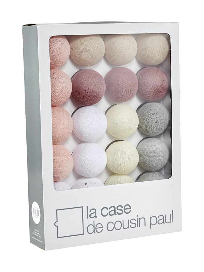 La Case de Cousin Paul -valosarjan palloissa on kaunis lankapunospinta ja pehmeä, lämmin valo. Valosarja sopii koristeeksi monenlaisiin sisustuksiin tai vaikkapa yövaloksi lastenhuoneeseen. Pallot pujotellaan itse valojen päälle, joten voit järjestellä valosarjan juuri sellaiseksi kuin itse haluat. Valosarjassa on 20 polyesterkuidulla päällystettyä palloa ja yhden pallon halkaisija on 7 cm. Kirkkaan johdon pituus on 1,5 m virtapistoke mukaan lukien ja pallojen väli on 14 cm. Valopallot ovat kaksinkertaisessa johtolenkissä.