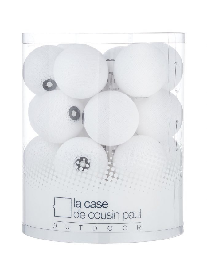 Luo puutarhaasi tai parvekkeellesi rentoa juhlatunnelmaa valosarjalla. LED-valosarjassa on 24 polyesteristä punottua valopalloa. Kiinnitys tapahtuu helposti patentoiduilla nipistimillä. Sisustusvalosarja on tarkoitettu ulkokäyttöön, ja ne kestävät sadetta ja UV-valoa. Ensimmäisen ja viimeisen valopallon välillä on 5 m, johdon pituus on 4 m. Pallojen halkaisija on 7 cm ja niitä on 22 cm:n välein.Ei ole suositeltavaa jättää valoja kovaan sateeseen yli 15 päiväksi tai ulos yli 120 päiväksi tai talviajaksi, sillä kova sade ja lumi voivat pehmentää pallon ja muuttaa sen muotoa. Vältä valopallojen koskemista kosteina.