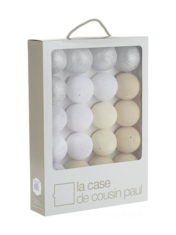 La Case de Cousin Paul -valosarjan palloissa on kaunis lankapunospinta ja pehmeä, lämmin valo. Valosarja sopii koristeeksi monenlaisiin sisustuksiin tai vaikkapa yövaloksi lastenhuoneeseen. Pallot pujotellaan itse valojen päälle, joten voit järjestellä valosarjan juuri sellaiseksi kuin itse haluat. Valosarjassa on 20 polyesterkuidulla päällystettyä palloa ja yhden pallon halkaisija on 7 cm. Kirkkaan johdon pituus on 1,5 m virtapistoke mukaan lukien ja pallojen väli on 14 cm. Valopallot ovat kaksinkertaisessa johtolenkissä.