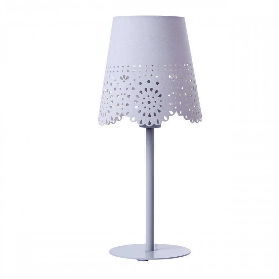 Pieni valkoinen pöytävalaisin, jossa koristeellinen, muovia ja tekstiiliä oleva varjostin (halk. 11 cm) ja metallinen jalka. Valaisimessa 1,2 metrin pituinen valkoinen johto, jossa katkaisija. Lamppu (kanta E14, max 40 W) myydään erikseen.