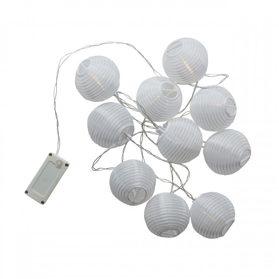 Kahdella AA-paristolla toimiva 10 pallon valoketju. Pallojen sisällä LED-lamput. Lampuista tulee lämpimän vaalea valo. Soveltuu myös ulkokäyttöön. Paristot eivät sisälly pakkaukseen.