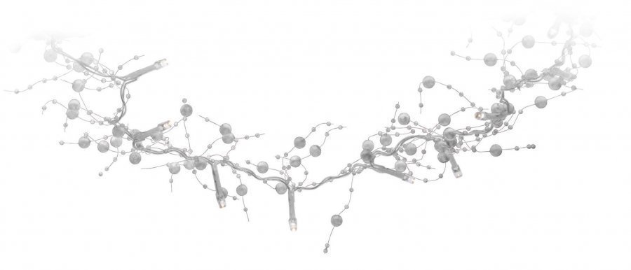 Koristeellinen paristokäyttöinen LED-helmikoristenauha. 20 kpl lämminvalkoista lediä. Nauhan pituus 130 cm. Lajitelmassa valittavana