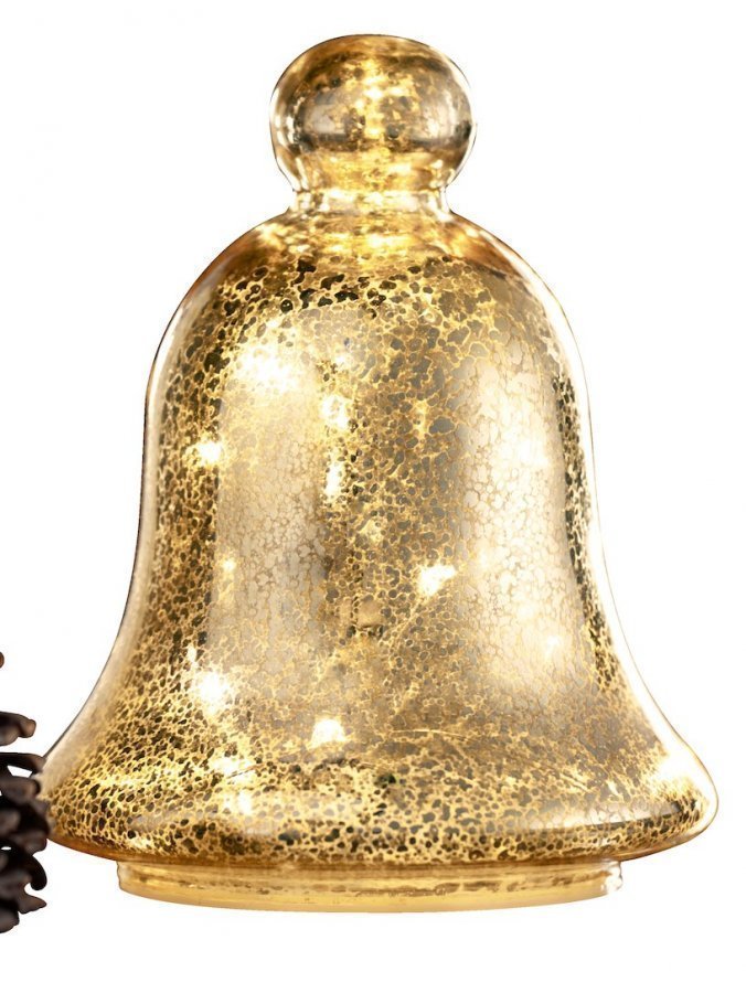 LED-valolla somistettu, jouluinen koristekello. Paristokäyttöinen, tarvitaan 3 x AAA-paristoa (eivät sisälly toimitukseen). Mitat K x Ø n. 13 x 10 cm. Materiaali lasia ja muovia.