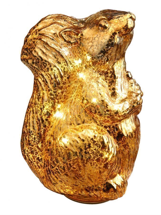 Suloinen oravan muotoinen LED-koriste. Hohtaa kauniin kullanvärisenä . Mitat (K x L x S n. 22 x 13 x 16 cm. Paristokäyttöinen, 3x AA-paristo (eivät sisälly toimitukseen).