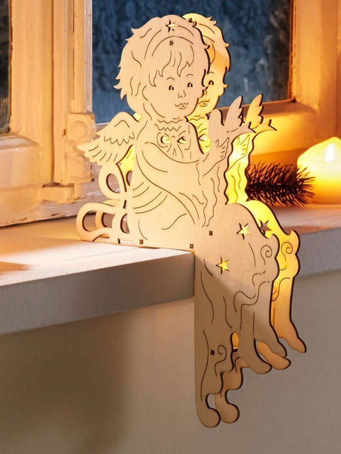 Perinteikäs valokoriste, aiheena enkeli. Yksityiskohtainen ja laadukas lehtisahattu työ. Laita istumaan esimerkiksi hyllyn tai ikkunalaudan reunalle. Paristokäyttöinen: 2x AA (eivät sisälly toimitukseen). KxLxS n. 33 x 20,5 x 3 cm. Lastulevyä.