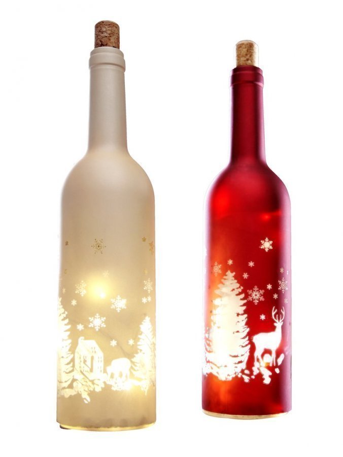 Koristeellista, jouluista viinipulloa muistuttava LED-koristevalaisin, joka taikoo tunnelmallisen valaistuksen huoneeseen. Kaksi per pakkaus. Tummanpunaisella/kullanvärisellä pohjalla oleva talvinen kuviointi antaa pulloille idyllisen ilmeen ja tekee niistä ihanteelliset joulun ajan somisteet. Korkeus n. 30 cm, pohjan läpimitta n. 7,3 cm. Materiaali lasia ja muovia. Paristot 3xAAA. Paristolokero pullon pohjassa. Paristot eivät sisälly toimitukseen.