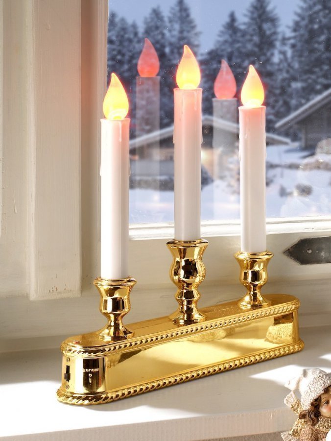 Ajattoman tyylikäs kynttelikkö, jossa 3 LED-kynttilää. Päälle-/pois-painike. Paristokäyttöinen: 2x D-paristo 1,5 V (eivät sisälly toimitukseen). Mitat (PxLxK) n. 23,5 x 5 x 25,5 cm. Materiaali muovia.