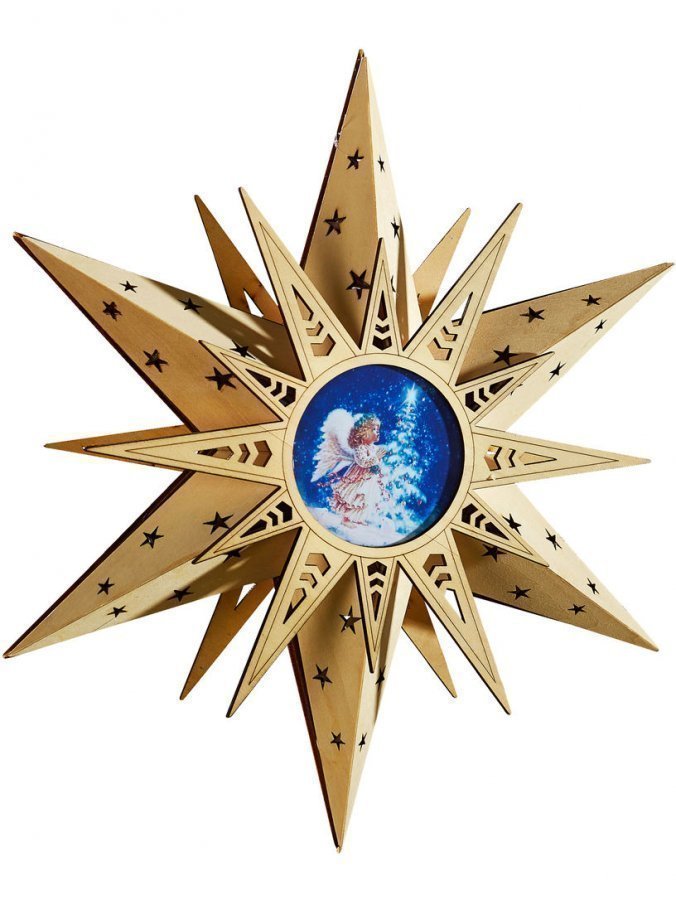 Puinen koristetähti, jossa lumoava enkeliaiheinen kuva ja LED-valosarja. Valo kuultaa kauniisti kuvan lävitse ja pilkottaa myös lukuisista koristeellisista rei’istä. Paristokäyttöinen, toimitukseen sisältyy 2x AA-paristo. Mukana lisäksi kaukosäädin ja ripustusnauha. Tähden Ø n. 30 tai 50 cm. LED-valosarjassa 12 hohtodiodia. Materiaali kuitulevyä, muovia.