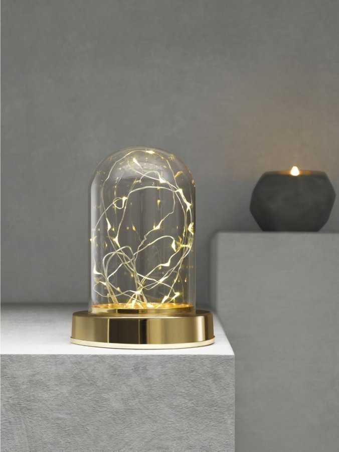 Lasikupolin alla on kauniisti loistava ledivalosarja. Lasikupolin halkaisija n. 10 cm, korkeus n. 15 cm. Metallipohjan halkaisija n. 13 cm, korkeus n. 2,5 cm. Paristot eivät sisälly toimitukseen.