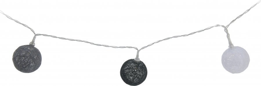 10-osainen LED-valopallosarja. Sarjassa valkoisia, vaaleanharmaita ja tummanharmaita lankapalloja. Pallojen halkaisija n. 4 cm. – 10 lämmin valkoista lediä – lamppuväli 15 cm – 30 cm liitosjohto – läpinäkyvä patterirasia (toimii 2xAA-paristoilla, ei sis. pakkaukseen)