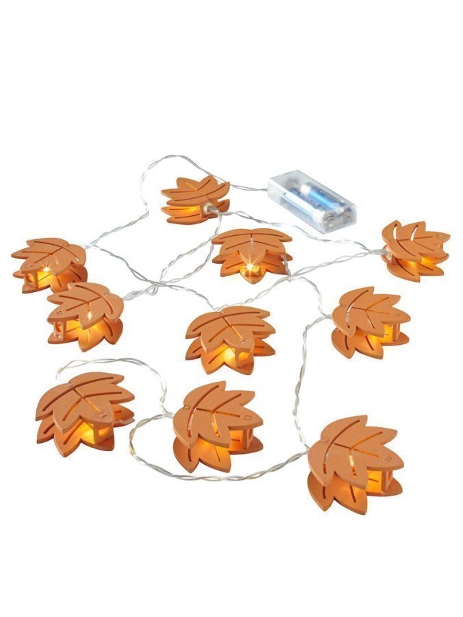 Syksyisiä iltoja kauniisti valaiseva LED-valosarja, jossa on 10 LED-valoa. Valot on asetettu syyslehden väristen, puusta valmistettujen lehtiparien väliin. Näin valosarjan lämpimän valkoinen valo loistaa kauniisti ja saa vielä lämpimämmän hohteen. Paristokotelo AA-paristoille (paristot eivät kuulu toimitukseen). Valosarjan pituus n. 165 cm, lehtien mitat (P x L x K) n. 5 x 6 x 1,8 cm. Materiaali muovia ja MDF-kuitulevyä.