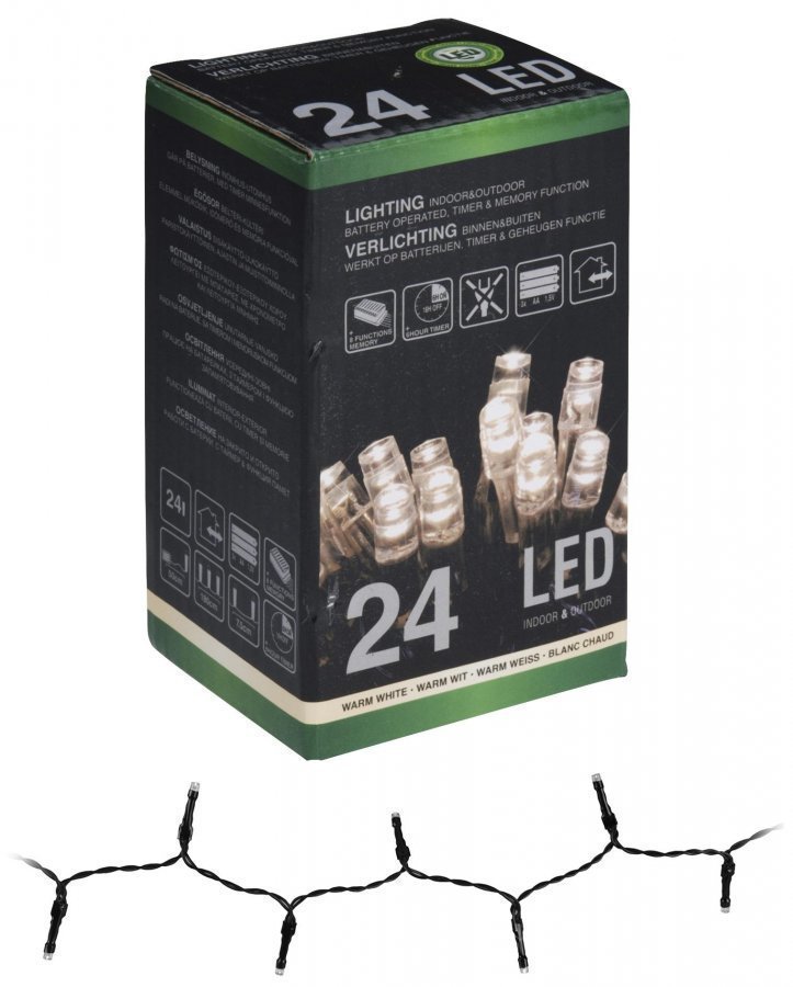 24-osainen patterikäyttöinen valosarja sisä- ja ulkokäyttöön. – lämminvalkoinen led – 5 mm polttimo