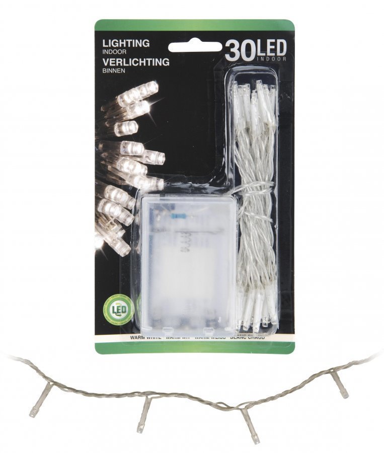 30-osainen paristokäyttöinen led-valosarja sisäkäyttöön. – lämmin valkoinen led – 3 mm polttimo –