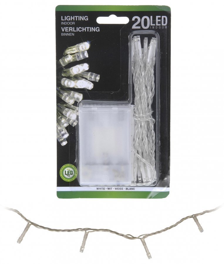 20-osainen paristokäyttöinen led-valosarja sisäkäyttöön. Lampun väri lämmin valkoinen. – 3 mm polttimo –