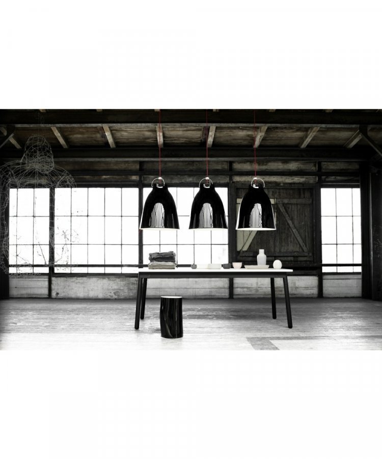 Design: Cecilie Manz for Light Years. Konsepti: Cecilie Manzin tavoitteena tämän elegantin kokoelman suhteen oli luoda yksinkertainen ja pehmeä muoto sekä suurille että pienille Caravaggio riippuvalaisimille. Caravaggio riippuvalaisin julkaistaan nyt neutraalina versiona, jossa on musta kromattu metalliripustus ja musta johto. Suunnitteluprosessin aikana valaisimen kaari sai useita eri muotoja, mutta tästä painoksesta tuli hyvin feminiininen. Varjostimen syvyys varmistaa sen, ettei valaisin häikäise millään asennuskorkeudella. Lisäksi Caravaggioon kuuluu pieni aukko valaisimen yläosassa antamassa ylöspäin suunnattua valoa, joka valaisee sekä ripustuksen että johdon. Caravaggio riippuvalaisin erottuu antamalla suoraa häikäisemätöntä valoa. Sen lisäksi valaisin parantaa huoneen yleisvalaistusta antamalla ylöspäin suunnattua valoa varjostimen yläosassa olevasta aukosta. Varjostin on tehty metallista kiiltävän lakkauksen päälle. Ripustuksessa käytetään taivutettua terästä, jossa on kaksi kierrettyä messinkistä osaa. Valaisin on käsitelty mustalla kromilla.