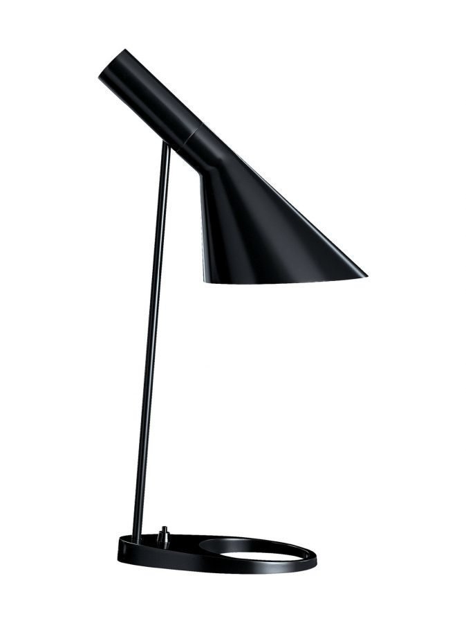 Arne Jacobsen suunnitteli yksinkertaisen tyylikkään AJ-valaisimen vuonna 1960 Kööpenhaminan Radisson SAS Royal -hotelliin. Ajattoman muotokielensä ansiosta valaisin sopii hyvin monenlaiseen ympäristöön. Kallistuva varjostin voidaan säätää haluttuun asentoon ja kohdistaa valo juuri sinne, missä sitä tarvitaan. Valonlähde E27, 60W. Korkeus on 56 cm, varjostimen pituus 35 cm, jalustan halkaisija 21,5 cm ja johdon pituus 2,4 m.