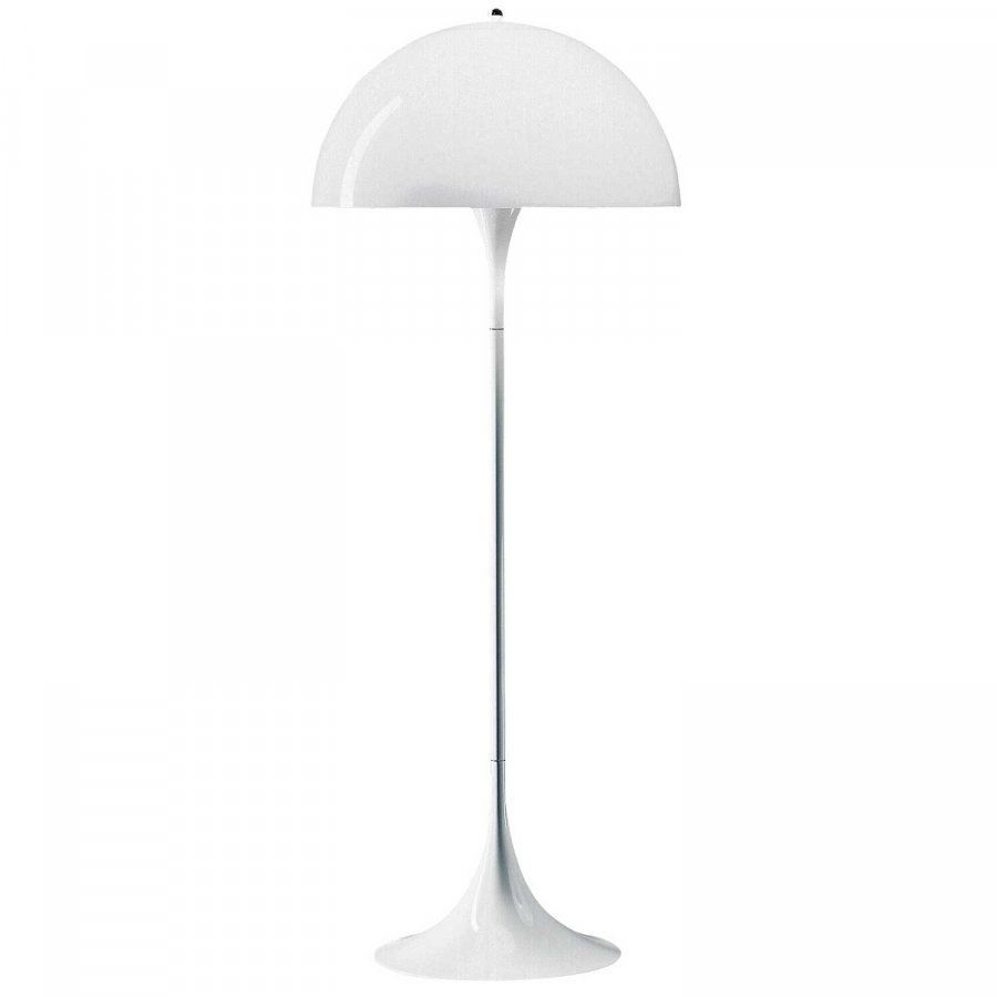 Panthella-lattialamppu Louis Poulsenilta, suunnittelu Verner Panton. Panthella-lattialampulla on luonnolliset ja tasapainoiset muodot. Varjostin on puolipallon muotoinen ja se muodostaa ympärilleen kauniin valon. Tuotteen historiaa:Verner Pantonin Panthella vuodelta 1971 on yksi hänen suosituimpia luomuksiaan kautta aikojen. Pääajatus lampun suunnitteluun oli luoda valaisin, jossa sekä varjostin että sen jalka heijastaisivat valoa mahdollisimman hyvin. Lampun valonlähde on piilotettu maidonvalkean varjostimen alle ja valkoinen, trumpetinmuotoinen tasapainottaa kokonaisuutta. Vuosien aikana lampusta on valmistettu useita erilaisia versioita, mutta valkoinen Panthella on ainoa tällä hetkellä tuotannossa oleva malli. ”Työni päätavoite on provosoida ihmisiä käyttämään luovuuttaan. ” – Verner Panton.