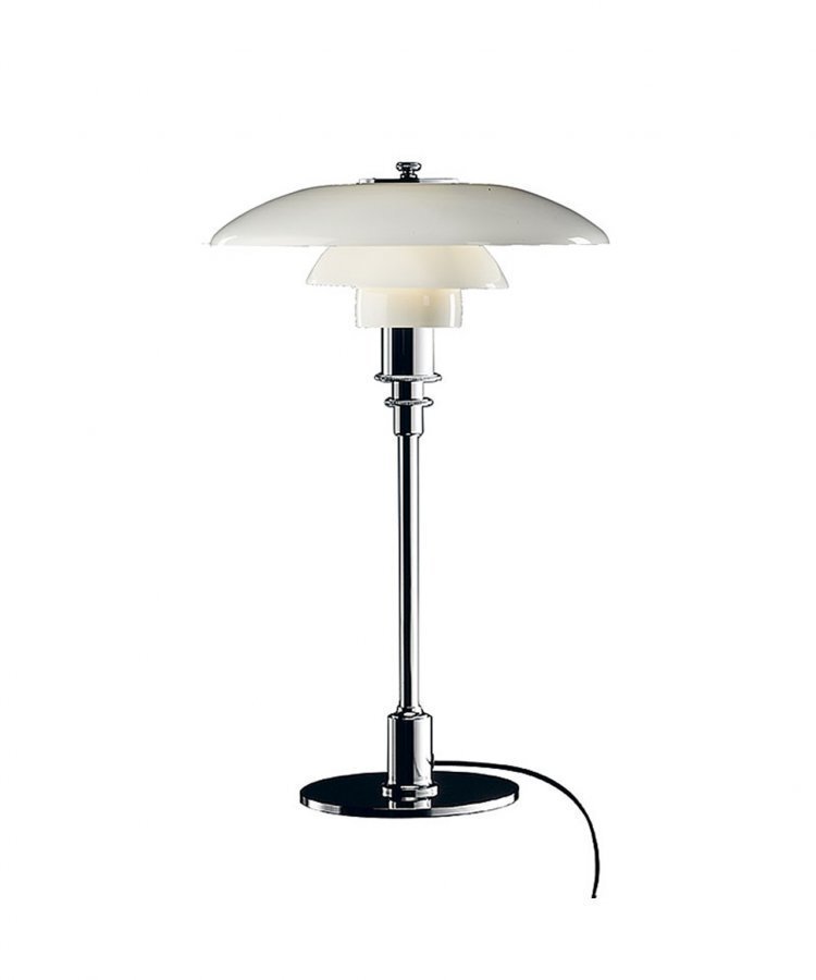 Design: Poul Henningsen for Louis Poulsen. Konsepti: PH 3/2 -valaisin on upea muotoilun ikoni, joka on yhä omaa luokkaansa sekä muotojensa että käytännöllisyytensä suhteen. 3/2 -kokoelma sisältää riippuvalaisimia, pöytävalaisimia, lattiavalaisimia, seinävalaisimia sekä kattokruunun. PH 3/2 Pöytävalaisin on osa kolmevarjostimisten valaisimien joukkoa, johon tällä hetkellä kuuluu yhteensä 18 eri valaisinta. Näistä kolme on suunniteltu ulkokäyttöön. Poul Henningsen loi kolmevarjostimisen valaisimen vuosina 1925-1926, jolloin hän yhdessä Louis Poulsenin kanssa suunnitteli ensimmäiset valaisimet Pariisissa järjestettyyn näyttelyyn. Läpi koko elämänsä PH pyrki luomaan häikäisemättömän ja pehmeän valon, joka on samalla taloudellinen. br>. Niinpä PH ei luonut pelkästään valaisinta vaan kokonaisen valaisinjärjestelmän. Vuosien saatossa siihen liittyen on valmistettu noin tuhat erilaista valaisinmallia. PH-valaisimien numerot viittaavat niiden varjostimien kokoon. Jokaiseen ylävarjostimeen kuuluu siihen liittyvä sarja alempia varjostimia. PH 3/2 -valaisimessa on noin 30 cm ylävarjostin, ja keskimmäinen ja alin varjostin ovat mallista 2/2. PH 3/2 -valaisimeen suunniteltiin heijastava monivarjostinjärjestelmä, joka perustuu logaritmisen spiraalin periaatteeseen – valonlähteen keskipiste sijaitsee spiraalin keskellä, ja se tuottaa laajalle levittäytynyttä ja häikäisemätöntä valoa. PH 3/2 Pöytävalaisimen suupuhallettu opaalilasi on kiiltävä ulkopuolelta ja hiekkapuhallettu matta sisäpuolelta. Se tuottaa pehmeää ja laajalle levinnyttä alaspäin suunnattua valoa.