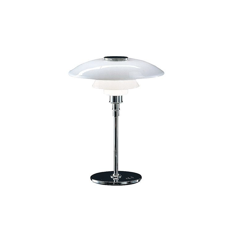 PH 4 1/2- 3 1/2 pöytävalaisin Louis Poulsenilta, suunnittelu Poul Henningsen. PH on sarja valaisimia, jotka Poul Henningsen suunnitteli 1920-luvulla. Kolminkertainen, suupuhalletu opaalilasi, joka on hiekkapuhallettu sisältä ja sileä ulkoa, luo pehmeän, häikäisemättömän valon. Valaisin on saatavana kahtena erilaisena variaationa.