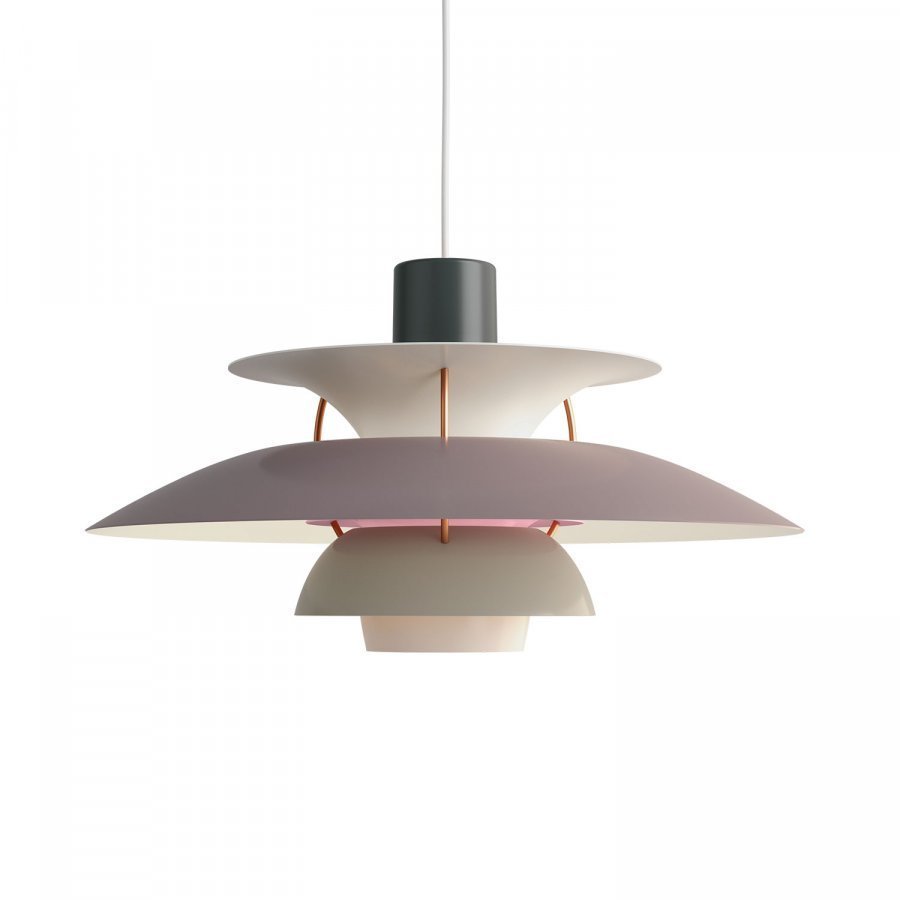 PH 5-kattolamppu Louis Poulsenilta, suunnittelu Poul Henningsen. PH 5-kattolamppu on suunniteltu häikäisemättömäksi ja sen muotoilu perustuu logaritmisen spiraalin muotoon, jonka keskipiste on valonlähde. Varjostimen erityinen muoto varmistaa, että valo jakaantuu niin pysty- kuin vaakasuunnassakin. Sisin kartio on maalattu punaiseksi joka yhdistettynä pienen, sinisen reaktorin kanssa luo kauniin, lämpimän valon.