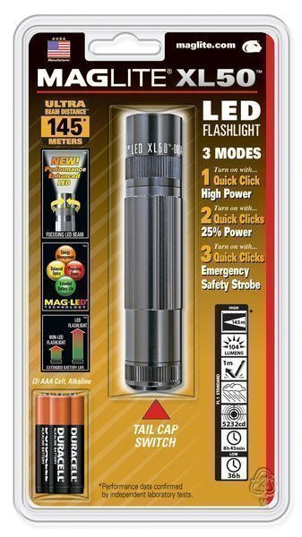2011 UUTUUS! MagLite LED XL50 on pieneen kokoonsa nähden poikkeuksellisen tehokas käsivalaisin. Mahtuu taskuun ja soveltuu päivittäiseen käyttöön niin ammattilaiselle kuin vapaa-aikaankin. Todellinen suorituskyky ilmoitetaan ANSI FL1 standardin mukaisesti. Helppokäyttöinen on-off kantakytkin. Uudenlainen yhdistelmävalokeila, joka näyttää samanaikaisesti sekä kauas että hyvin leveälle lähelle, jolloin näkee koko katselualueen kerralla. Tehoalueen leveys säädettävissä käyttöetäisyyden mukaan. Facebook ja muita etuja ei voida yhdistää tarjoukseen Kantakytkimestä voit valita käyttötilan: – 1 painallus: Tehovalo – 2 painallusta: Energiansäästövalo (25%) – 3 painallusta: Turvavilkku Lentokonealumiinia, anodisoitu parhaan korroosionkeston ja kulutuskeston saavuttamiseksi. Suorityskyky ANSI FL1 standardin mukaisesti: Valon kantama 145 m, valovirta 104 lumenia, valon voimakkuus 5323 candelaa. Paloaika 8h 45min – 36h (jonka jälkeen on vielä 10% alkuperäisestä tehosta jäljellä). Iskunkestävä 1m, roiskevesitiivis. Intelligent Energy Source Management -virranhallintaelektroniikka optimoi paloajan. Pituus: 12,1cm. Halk: 2,5cm. Paino 104g paristoilla, 49g ilman. 3xAAA laadukkaat paristot sis. Jokainen valaisin on sarjanumeroitu. Takuu 10 v. Huoltopalvelu Suomessa. Made in USA, valmistuspaikka lukee valaisimessa. Toimitetaan retail -kuplapakkauksessa monikielisten käyttöohjeiden kanssa. XL50-S3096