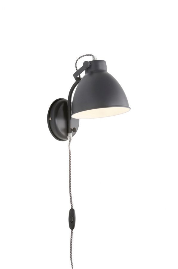 Teollis- ja retrohenkinen seinävalaisin metallia. Kangaspäällysteinen, kuviokuosinen johto on tyylikäs yksityiskohta. Materiaali: Metallia. Koko: Korkeus 25 cm, syvyys 26 cm, varjostimen ø 17 cm, seinäkiinnikkeen ø 13 cm. Kuvaus: Seinävalaisin metallia. Säädettävä varjostin. Kangaspäällysteinen johto 150 cm. Kanta/lamppu: 1 x E14, enintään 40 W:n hehkulamppu tai enintään 7 W:n energiansäästölamppu. Vinkki: Huoneessa tuee olla 5–8 valaisinta, jotta valo jakautuu tasaisesti huoneeseen. Lue valaisinoppaan vinkit ja neuvot.