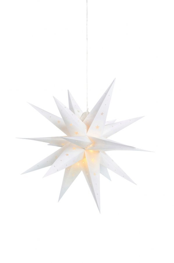 Vectra 3D -valotähti. Muovia. Halkaisija 60 cm. IP44-muuntaja. 12 LED-valonlähdettä. 5 metrin läpikuultava liitäntäjohto.