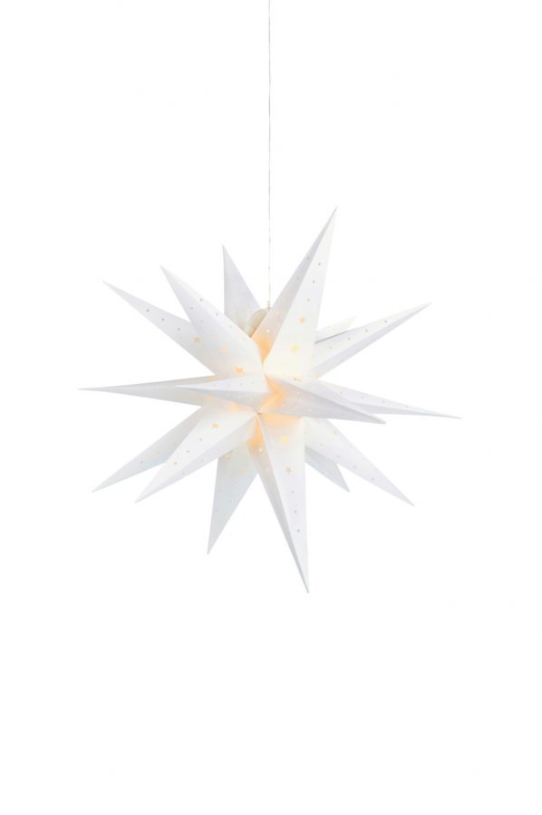 Vectra 3D -valotähti. Muovia. Halkaisija 80 cm. IP44-muuntaja. 12 LED-valonlähdettä. 5 metrin läpikuultava liitäntäjohto.