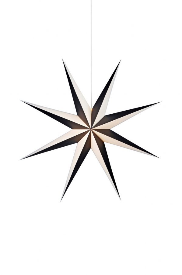 Pahvista valmistettu joulutähti. Ø 75 cm. Syvyys 18 cm. Johdossa virtakytkin, johdon pituus 3,5 m. E14.