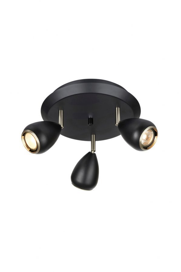 Markslöjd Bike -kattovalaisin/rondelli. Mustaa metallia. Säädettävät varjostimet ja detaljit terästä. Halkaisija 33 cm, korkeus 18 cm. Lampunkanta: GU10, 3 kpl. Enintään 12 W:n LED. Valonlähde ei mukana. Suunnittelija Joakim Thedin.