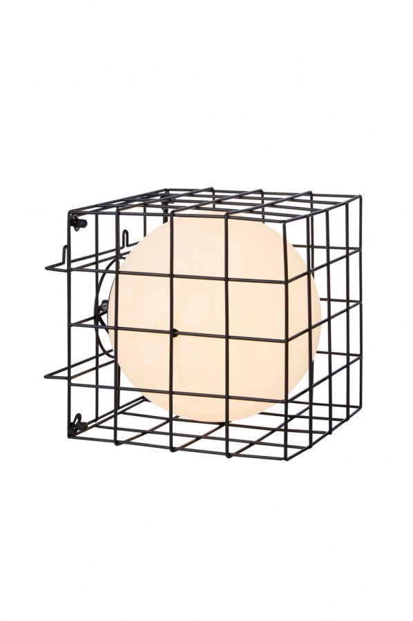 Markslöjd Cage -pöytä-/seinävalaisin. Runko metallia ja varjostin lasia. Korkeus 24 cm, leveys ja syvyys 21 cm. 2 m:n kangasjohto, jossa virtakytkin. Pieni lampunkanta E14, enintään 40 W:n hehkulamppu tai vastaava halogeeni-, energiansäästö- tai LED-lamppu. Valonlähde ei mukana.