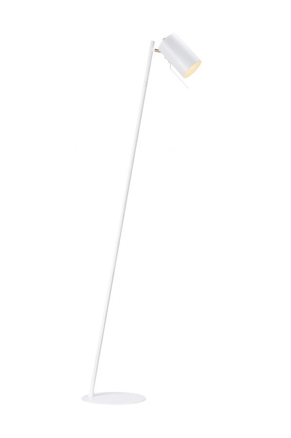 Markslöjd Carrie -lattiavalaisin. Valkoiseksi maalattu, detaljit messinkiä. GU10, enintään 35 W. Valonlähde ei mukana. Sisäänrakennettu himmennin.