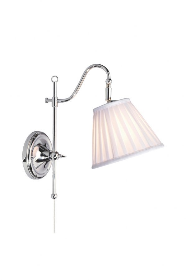 Markslöjd Charleston -seinävalaisin. Kromattu metallirunko ja valkoinen kangasvarjostin. 2 m:n johto, jossa katkaisin. Pieni E14-lampunkanta. Enintään 40W tai vastaava halogeeni-, energiansäästö- tai LED-lamppu.
