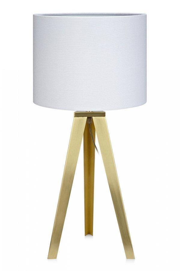Markslöjd Fiori -pöytävalaisin. Metallijalka messinkiä, valkoinen kangasvarjostin. 2 metrin pituinen johto, jossa katkaisin. Lampunkanta E27. Pituus 27 cm, leveys 27 cm, korkeus 58 cm. Lamppu ei mukana.