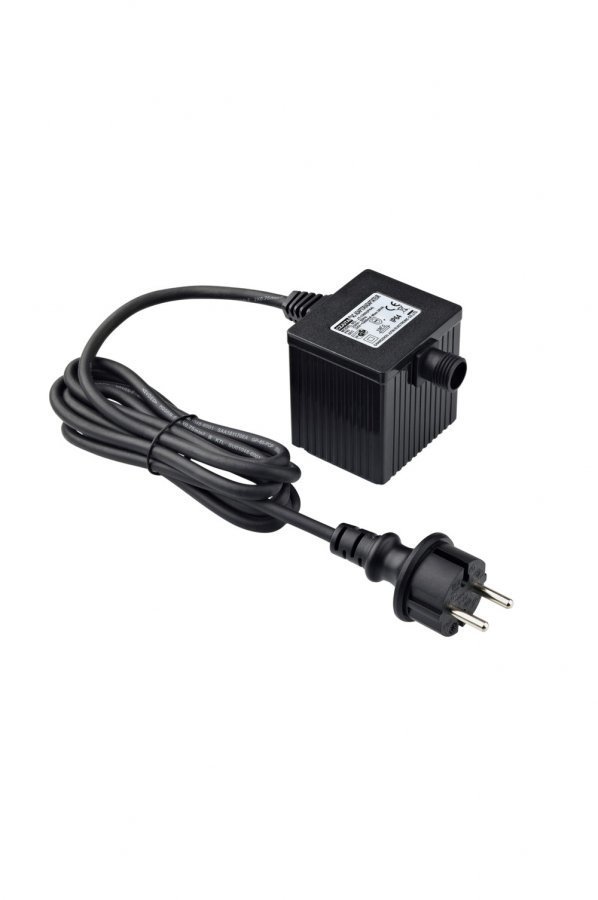 Markslöjd Garden -muuntaja 24V AC. IP44 hyväksytty ulkokäyttöön. 2 m liitäntäjohto, jossa seinäpistoke. Muuntajan jännite 24 V AC, maksimikuormitus 36 W.
