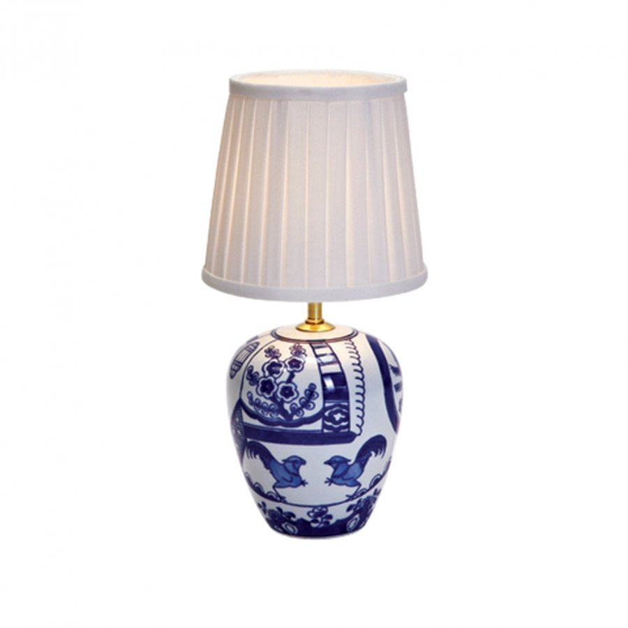 Göteborg-pöytävalaisin, joka on saanut innoitusta vanhanajan posliinista. Sinivalkoinen jalka ja valkoinen vekkivarjostin. Leveys 17 cm. Syvyys 17 cm. Korkeus 33 cm.