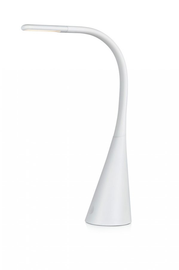 Markslöjd Hale -pöytävalaisin valkoista akryyliä. USB-liitäntä (1A) älypuhelimen lataamista varten. 1,8 metrin pituinen johto, jossa seinäpistoke. Sisäänrakennettu himmennin. 4W:n kiinteä LED-lamppu. Pituus 11 cm, leveys 25 cm, korkeus 48 cm.