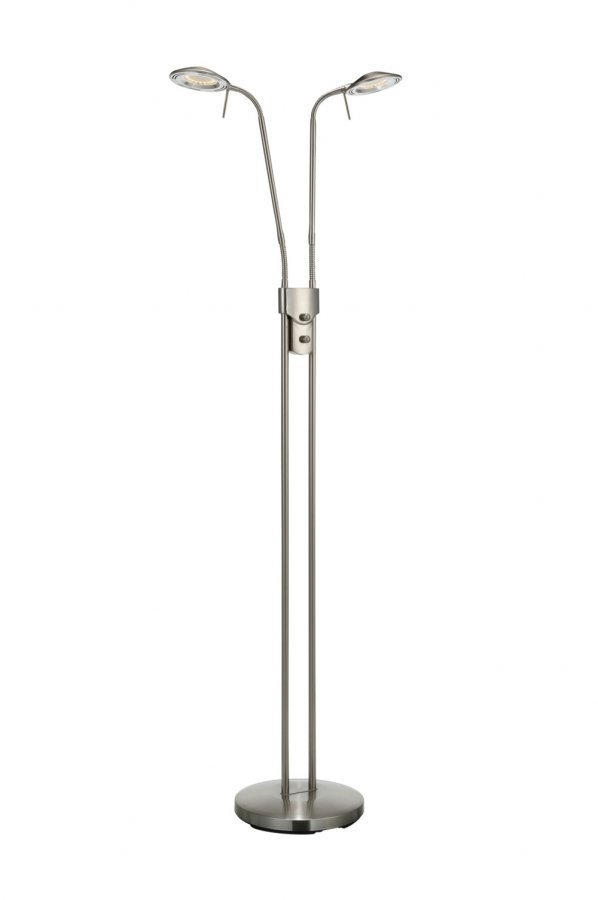 Markslöjd Hudson -lattiavalaisin metallia. Kaksi säädettävää varjostinta, joissa kaksoisjoustonivel. Pylväässä kaksi sisäänrakennettua himmennintä. 2 kiinteää LED-lamppua, 2 x 6 W ja 2 x 450 lumenia. 120° valaistuskulma. 3000 K.