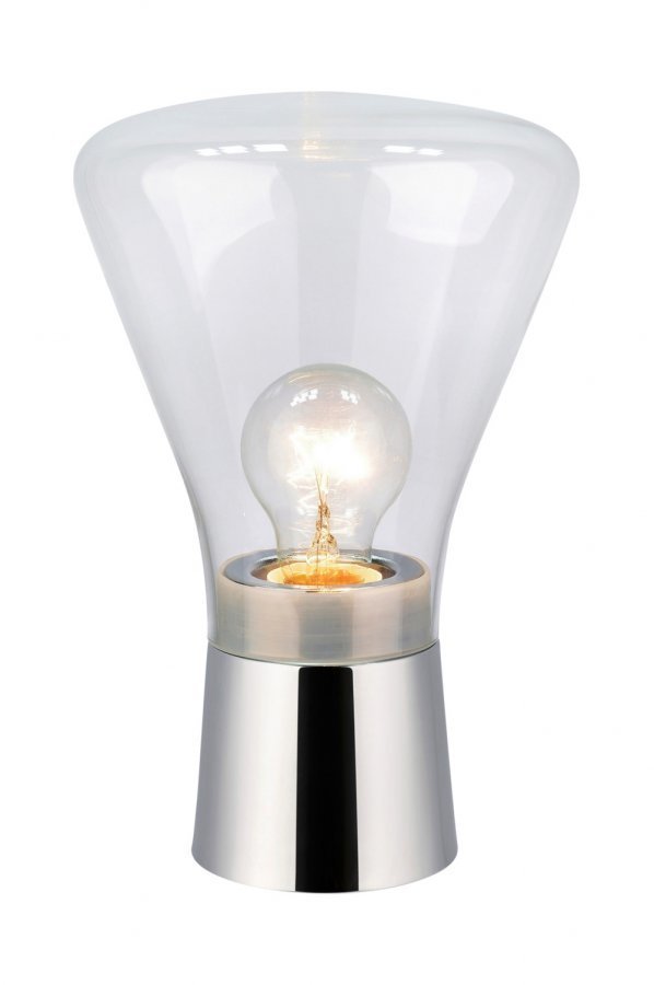 Markslöjd Jack -pöytävalaisin kromia, varjostin lasia. 2 m:n kangasjohto, jossa katkaisin. Iso E27-lampunkanta. Enintään 40 W:n hehkulamppu tai vastaava halogeeni-, energiansäästö- tai LED-lamppu. Lamppu ei sisälly pakkaukseen.