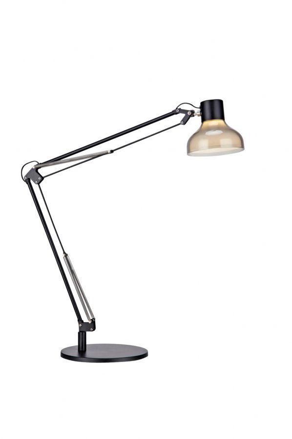 Markslöjd Jock-pöytävalaisin. Metallirunko, kupu huurrelasia. Kiinteä LED 5 W, ei himmennettävä. Pituus 17, leveys 40, korkeus 62 cm.