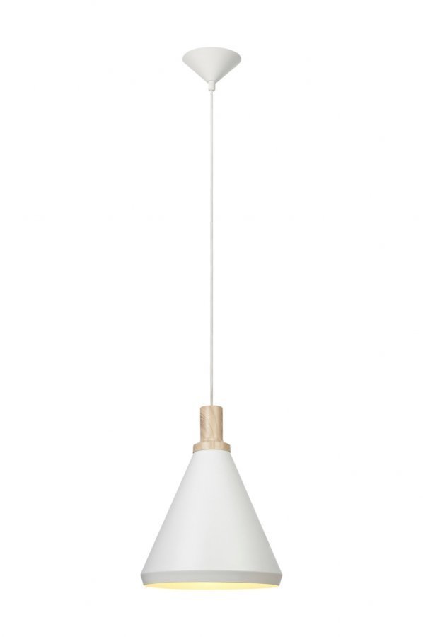 Markslöjd Leonardo -kattovalaisin. Valkoista metallia, yksityiskohdissa vaalea puupainatus. Iso lampunkanta E27, enintään 60 W:n hehkulamppu tai vastaava halogeeni-, energiansäästö- tai LED-lamppu. 1,5 metrin kangaspäällysteinen johto ja koukkuripustus. Mukana luokan 1 kattopistoke (maadoitettu).