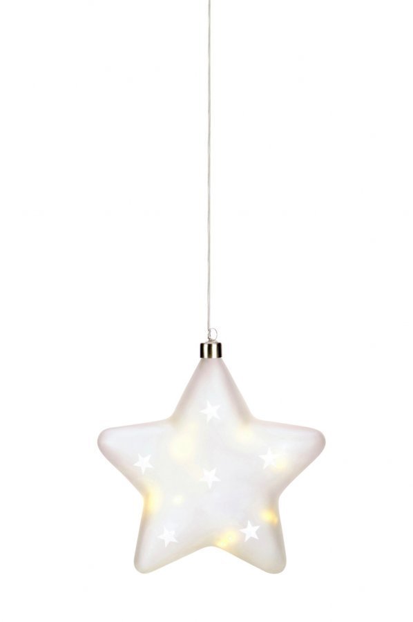 Lisette-valotähti huurrelasia. Ø 18 cm. Johdon pituus 150 cm. Enintään 0,3 W. Toimii kolmella AA-paristolla. Tilaa paristot erikseen.