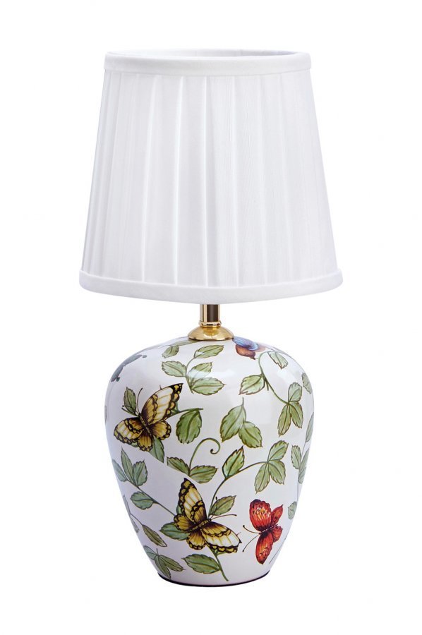 Markslöjd Mansion-pöytävalaisin. Jalka valkoista keramiikkaa, jossa perhoskuvio. Valkoinen kangasvarjostin. 2 m:n läpikuultava johto. Virtakytkin johdossa. Pieni lampunkanta E14, enintään 40 W. Leveys 16,5 cm Korkeus 32,5 cm Syvyys 16,5 cm Teho 40 W Lampunkanta E14