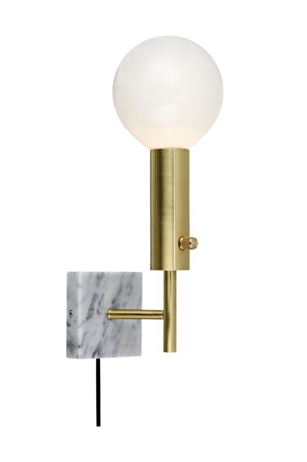 LampGustaf Marble -seinävalaisin. Harjattua messinkiä, seinälevy marmoria. Opaalinväristä lasia. Virtakytkimessä himmennin. Halogeeni 28 W, lampunkanta G9, adapteri E27.